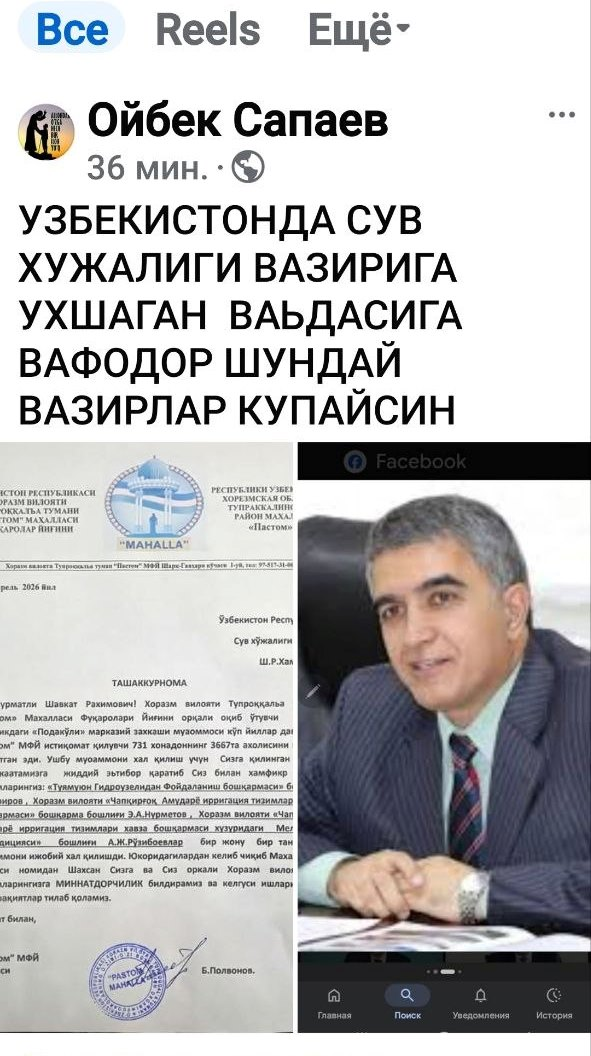 Ушбу мурожаат юзасидан Вазирнинг оператив равишда берган топшириқларига асосан Чапқирғоқ Амударё ирригация тизимлари ҳавза бошқармаси, Мелиоратив экспедиция ҳамда “Туямўйин гидроузелидан фойдаланиш” бошқармалари раҳбарлари томонидан объект ҳолати жойига чиқиб ўрганилиб, аниқланган муаммоларни тез фурсатларда ҳал этишга қаратилган чора-тадбирлар амалга оширилди.